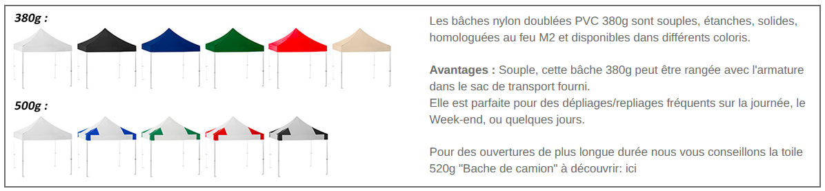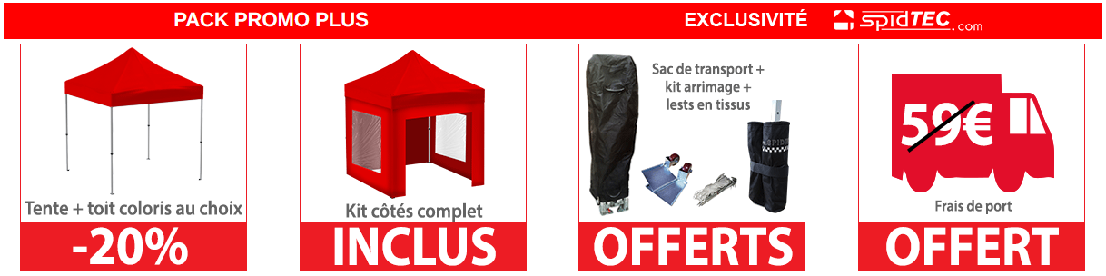 Profitez de notre offre tente pliante PRO 40 pack promo + , Composé d'une Structure aluminium 40mm Spidtec, d'une toile de barnum  en nylon doublée PVC 380g ou 500g/m² 100% étanche UV 80 certifiée M2 , d'un kit coté nylon Classique 380g/m² ou 500g/m² dont 2 fenêtres occultables, 1 mur plein et 1 porte, d'un sac roulette pour la tente pliable offert, d'un kit arrimage offert, de lests en tissus offerts.