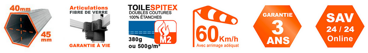 La structure du barnum en profilés hexagonaux aluminium de 40/45mm et les croisillons à renfort interne (exclusivité Spidtec) offrent le meilleur compromis entre poids et solidité. Gage de sérieux: Les pièces d’articulation en Nylon injecté de nos tonnelles sont garanties à vie !